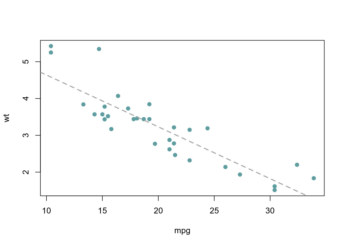 abline(lm(wt~mpg, data=mtcars), lty = 2, lwd = 2, col = 'grey65')